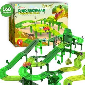 - 168 Teile: magnetische Fliesen, Kurven, Rampen, Brücken, Dinos und Dekoration